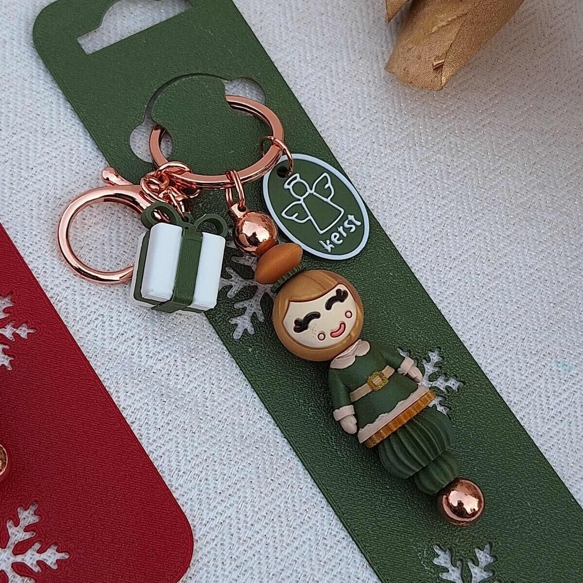 Breng de magie van kerst tot leven met onze handgemaakte kerstpop-sleutelhangers. Een verfijnd detail dat elk cadeautje of sleutelbos een feestelijke toets geeft.